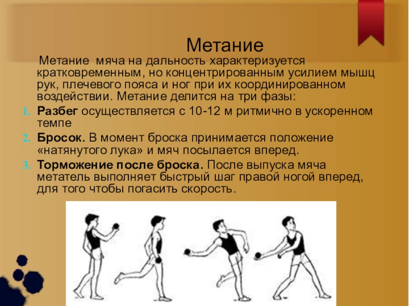 Метание  Метание мяча на дальность характеризуется кратковременным, но концентрированным усилием мышц рук, плечевого пояса и ног
