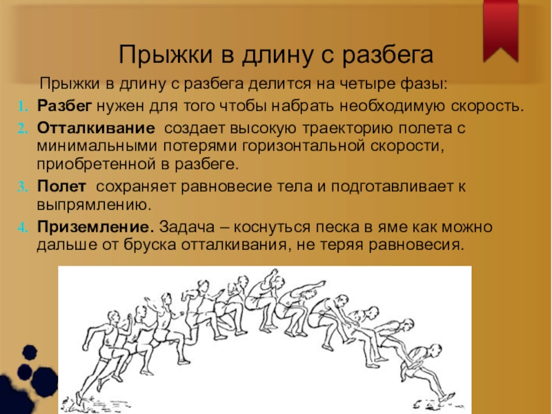 Прыжки в длину с разбега  Прыжки в длину с разбега делится на четыре фазы:Разбег нужен для
