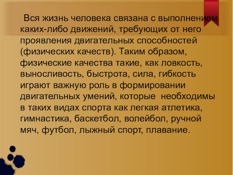 Вся жизнь человека связана с выполнением каких-либо движений, требующих от него проявления двигательных способностей(физических качеств).