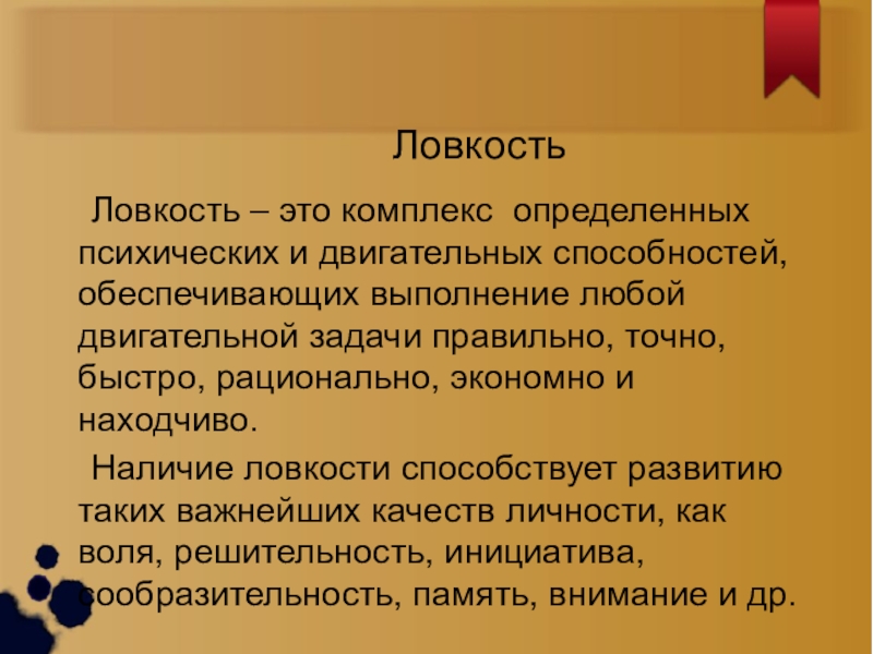 Ловкость  Ловкость – это комплекс определенных психических и двигательных способностей, обеспечивающих выполнение любой двигательной задачи правильно,