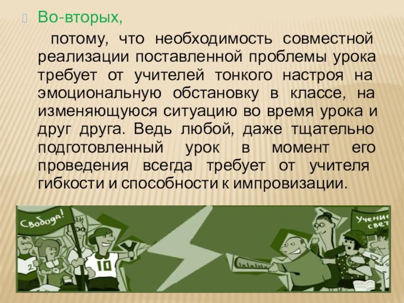требует от учителей тонкого настроя на эмоциональную обстановку в классе, на изменяющуюся ситуацию во время урока и друг друга. Ведь любой, даже тщательно подготовленный урок в момент его проведения всегда требует от учителя гибкости и способности к импровизации.