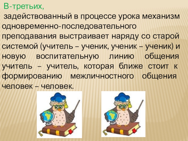 со старой системой (учитель – ученик, ученик – ученик) и новую воспитательную линию общения учитель – учитель, которая ближе стоит к формированию межличностного общения человек – человек.