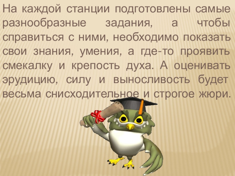 Слайд 11На каждой станции подготовлены самые разнообразные задания, а чтобы справиться с