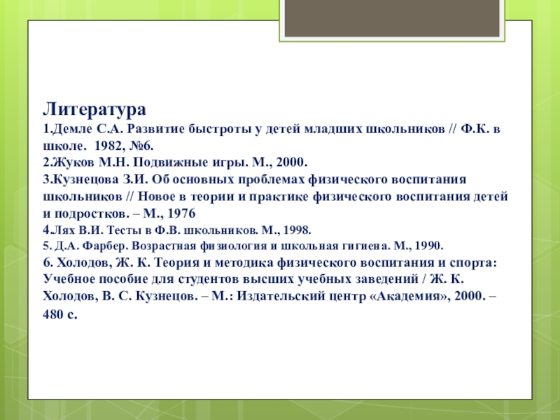 1.Демле С.А. Развитие быстроты у детей младших школьников // Ф.К. в