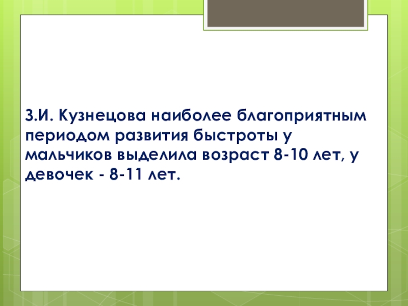 Слайд 9З.И. Кузнецова наиболее благоприятным периодом развития быстроты у мальчиков выделила возраст