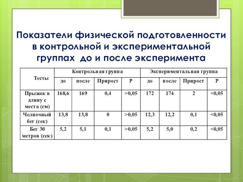 Слайд 14Показатели физической подготовленности в контрольной и экспериментальной группах до и после