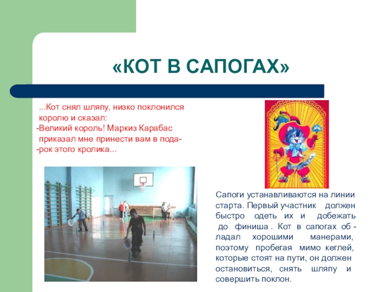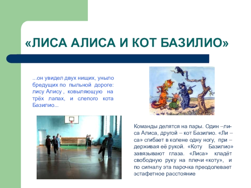 держивая её рукой. «Коту Базилио» завязывают глаза. «Лиса» кладёт свободную руку на плечи «коту», и по сигналу эта парочка преодолевает