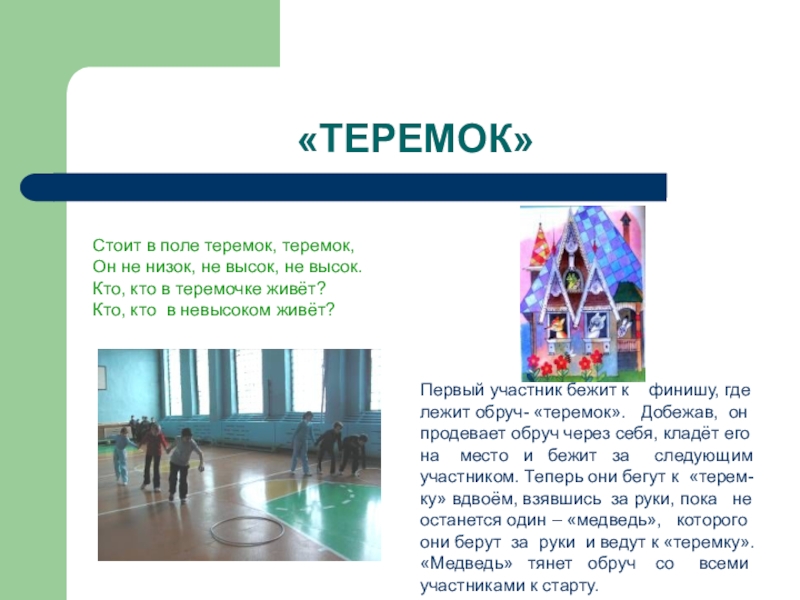 ку» вдвоём, взявшись за руки, пока не останется один – «медведь», которого они берут за руки и ведут к «теремку». «Медведь» тянет обруч со всеми участниками к старту.