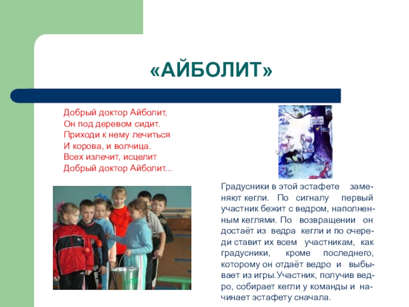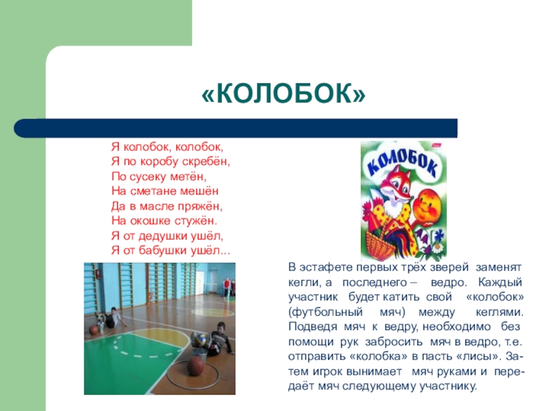 В эстафете первых трёх зверей заменят кегли, а последнего – ведро. Каждый участник будет катить свой «колобок» (футбольный мяч) между кеглями. Подведя мяч к ведру, необходимо без помощи рук забросить мяч в ведро, т.е. отправить «колобка» в пасть «лисы». За-