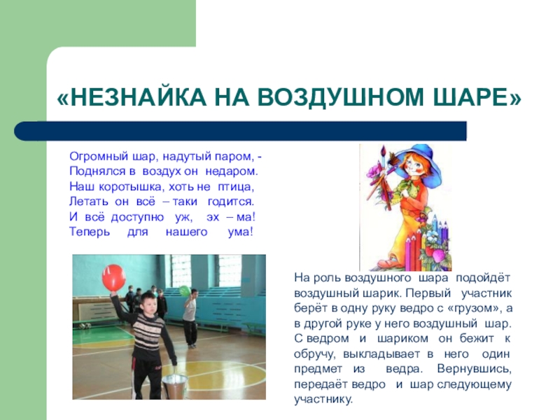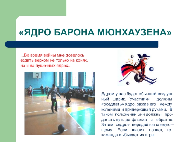 ный шарик. Участники должны «оседлать» ядро, зажав его между коленями и придерживая руками. В таком положении они должны про-
