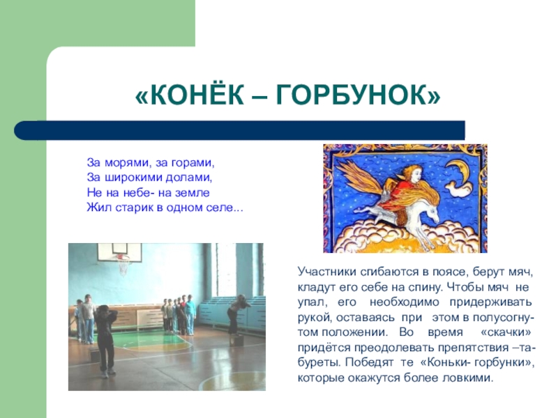 буреты. Победят те «Коньки- горбунки», которые окажутся более ловкими.