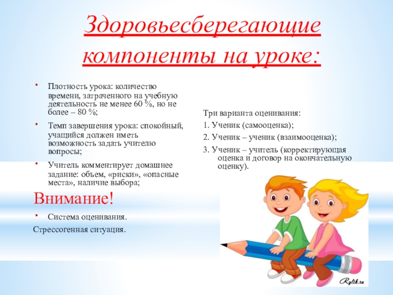 Слайд 16Здоровьесберегающие компоненты на уроке: