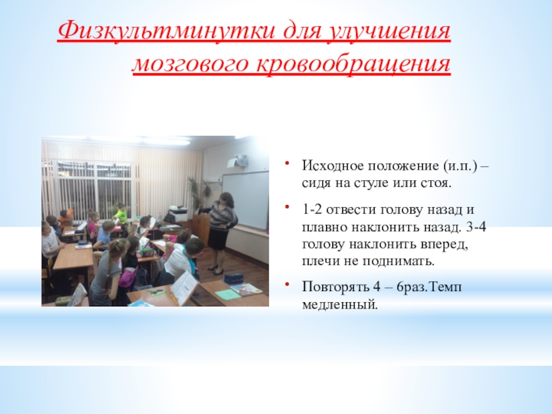 Слайд 11Физкультминутки для улучшения мозгового кровообращения
