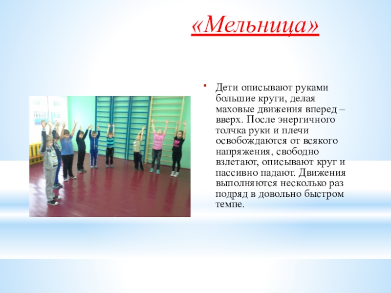 После энергичного толчка руки и плечи освобождаются от всякого напряжения, свободно взлетают, описывают круг и пассивно падают. Движения выполняются несколько раз подряд в довольно быстром темпе.