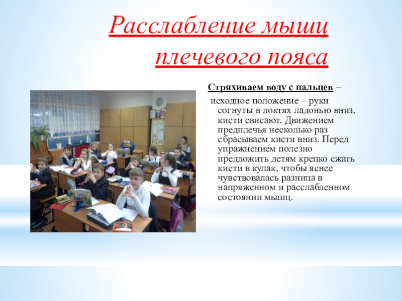 руки согнуты в локтях ладонью вниз, кисти свисают. Движением предплечья несколько раз сбрасываем кисти вниз. Перед упражнением полезно предложить детям крепко сжать кисти в кулак, чтобы яснее чувствовалась разница в напряженном и расслабленном состоянии мышц.