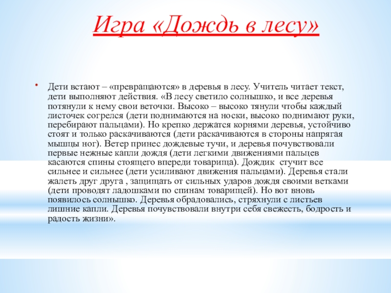 Учитель читает текст, дети выполняют действия. «В лесу светило солнышко, и все деревья потянули к нему свои веточки. Высоко – высоко тянули чтобы каждый листочек согрелся (дети поднимаются на носки, высоко поднимают руки, перебирают пальцами). Но крепко держатся корнями деревья, устойчиво стоят и только раскачиваются (дети раскачиваются в стороны напрягая мышцы ног). Ветер принес дождевые тучи, и деревья почувствовали первые нежные капли дождя (дети легкими движениями пальцев касаются спины стоящего впереди товарища). Дождик стучит все сильнее и сильнее (дети усиливают движения пальцами). Деревья стали жалеть друг друга , защищать от сильных ударов дождя своими ветками (дети проводят ладошками по спинам товарищей). Но вот вновь появилось солнышко. Деревья обрадовались, стряхнули с листьев лишние капли. Деревья почувствовали внутри себя свежесть, бодрость и радость жизни».