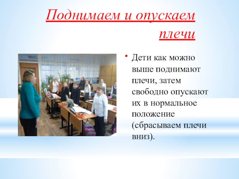 опускают их в нормальное положение (сбрасываем плечи вниз).