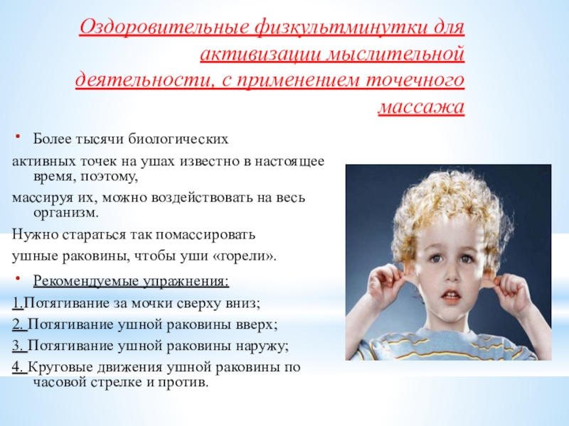 Слайд 12Оздоровительные физкультминутки для активизации мыслительной деятельности, с применением точечного массажа