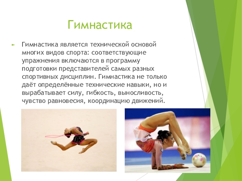 программу подготовки представителей самых разных спортивных дисциплин. Гимнастика не только даёт определённые технические навыки, но и вырабатывает силу, гибкость, выносливость, чувство равновесия, координацию движений.
