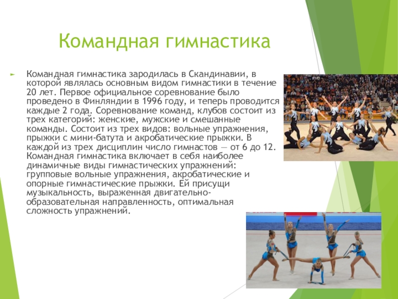 в течение 20 лет. Первое официальное соревнование было проведено в Финляндии в 1996 году, и теперь проводится каждые 2 года. Соревнование команд, клубов состоит из трех категорий: женские, мужские и смешанные команды. Состоит из трех видов: вольные упражнения, прыжки с мини-батута и акробатические прыжки. В каждой из трех дисциплин число гимнастов — от 6 до 12. Командная гимнастика включает в себя наиболее динамичные виды гимнастических упражнений: групповые вольные упражнения, акробатические и опорные гимнастические прыжки. Ей присущи музыкальность, выраженная двигательно-образовательная направленность, оптимальная сложность упражнений.