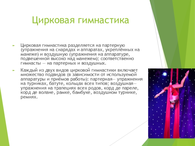 Цирковая гимнастика разделяется на партерную (упражнения на снарядах и аппаратах,