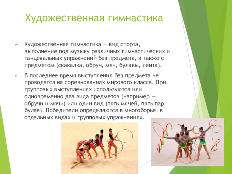 Художественная гимнастика — вид спорта, выполнение под музыку различных гимнастических