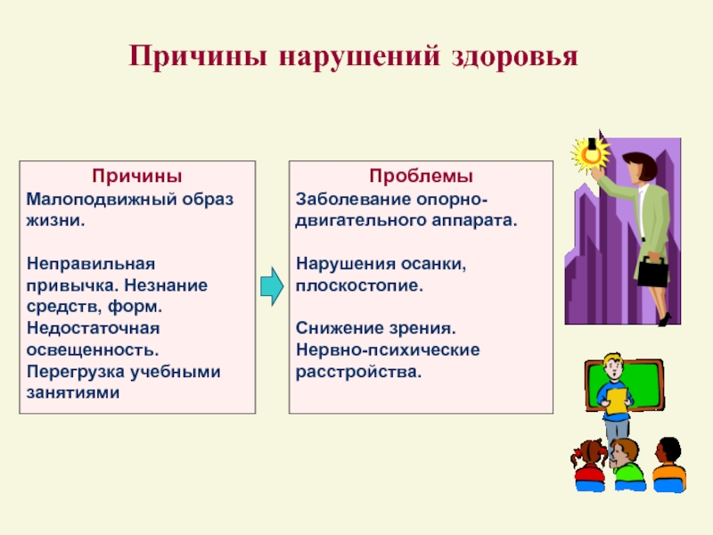 Причины нарушений здоровьяПроблемыЗаболевание опорно-двигательного аппарата.Нарушения осанки, плоскостопие.Снижение зрения.Нервно-психические расстройства.ПричиныМалоподвижный образ жизни.Неправильная привычка. Незнание средств, форм.Недостаточная освещенность. Перегрузка