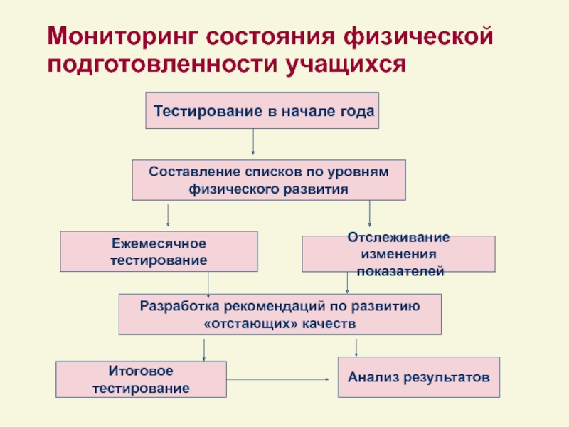 Мониторинг состояния физической подготовленности учащихсяТестирование в начале годаСоставление списков по уровням физического развитияЕжемесячное тестированиеРазработка рекомендаций по развитию«отстающих»
