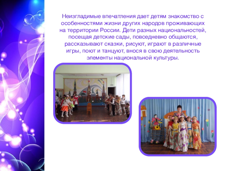 других народов проживающих на территории России. Дети разных национальностей, посещая детские сады, повседневно общаются, рассказывают сказки, рисуют, играют в различные игры, поют и танцуют, внося в свою деятельность элементы национальной культуры.