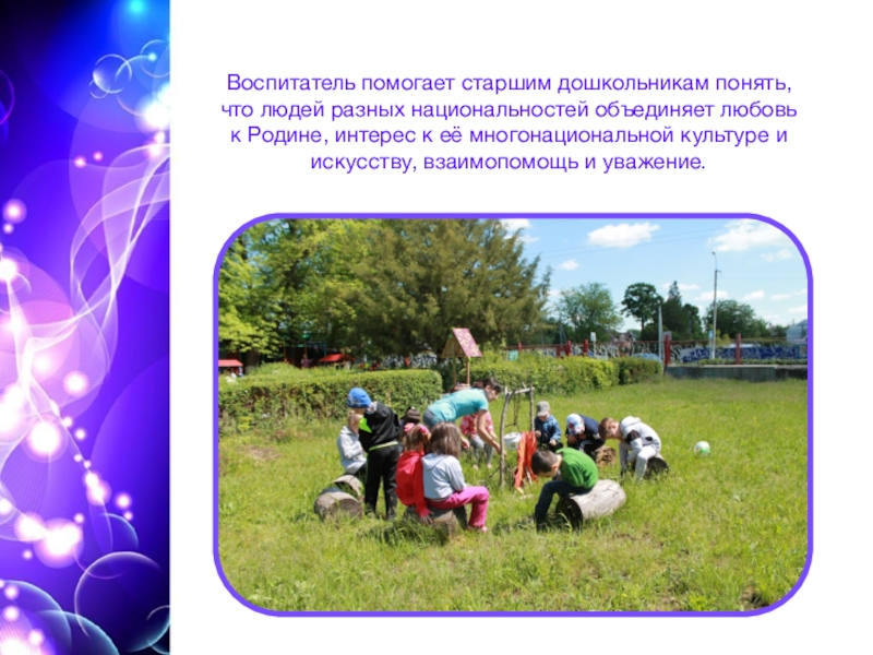 Слайд 7Воспитатель помогает старшим дошкольникам понять, что людей разных национальностей объединяет любовь