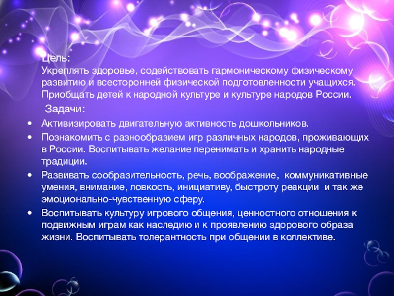 Укреплять здоровье, содействовать гармоническому физическому развитию и всесторонней физической подготовленности учащихся. Приобщать детей к народной культуре и культуре народов России.