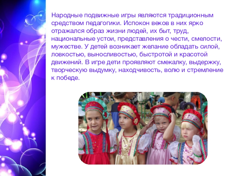 Слайд 5Народные игры являются неотъемлемой частью интернационального, художественного и физического воспитания дошкольников.