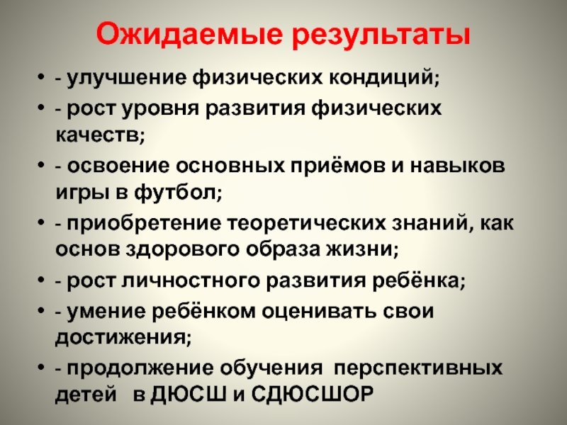 Ожидаемые результаты- улучшение физических кондиций; - рост уровня развития физических качеств; - освоение основных приёмов и навыков