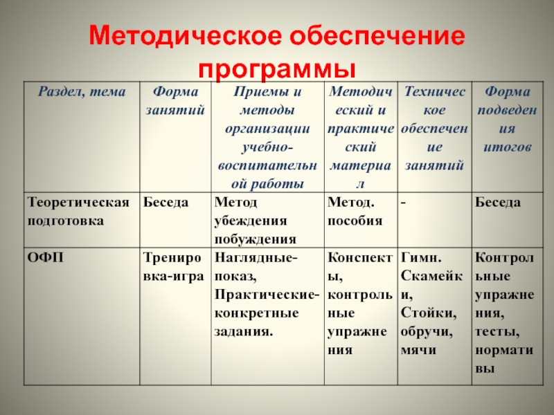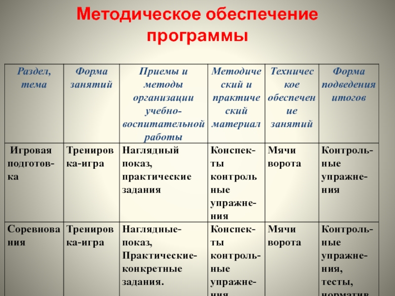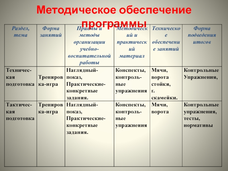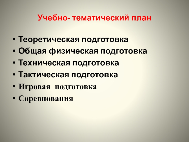 Учебно- тематический планТеоретическая подготовка Общая физическая подготовка Техническая подготовка Тактическая подготовка Игровая подготовкаСоревнования