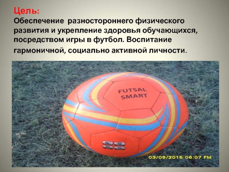 Цель: Обеспечение  разностороннего физического развития и укрепление здоровья обучающихся, посредством игры в футбол. Воспитание гармоничной, социально активной