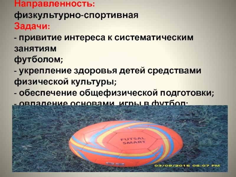 футболом; - укрепление здоровья детей средствами физической культуры; - обеспечение общефизической подготовки; - овладение основами  игры в футбол;
