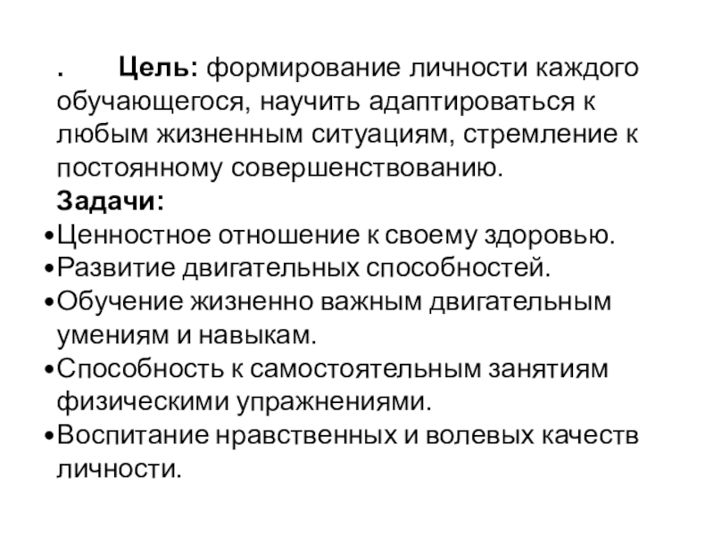 .    Цель: формирование личности каждого обучающегося, научить адаптироваться к любым жизненным ситуациям, стремление к