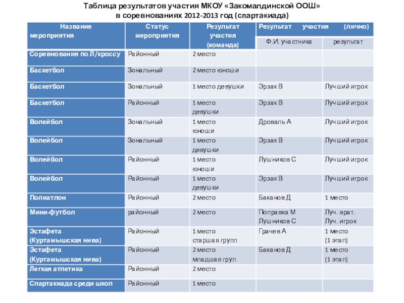 Слайд 37Таблица результатов участия МКОУ «Закомалдинской ООШ» в соревнованиях 2012-2013 год (спартакиада)