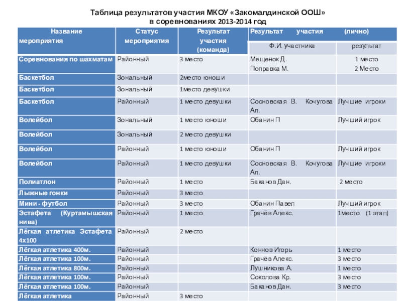 Таблица результатов участия МКОУ «Закомалдинской ООШ» в соревнованиях 2013-2014 год