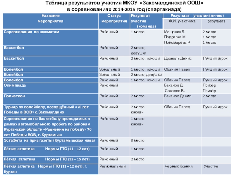 Таблица результатов участия МКОУ «Закомалдинской ООШ»в соревнованиях 2014-2015 год (спартакиада)