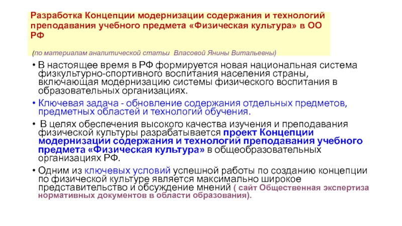 В целях обеспечения высокого качества изучения и преподавания физической культуры разрабатывается проект Концепции модернизации содержания и технологий преподавания учебного предмета «Физическая культура» в общеобразовательных организациях РФ.