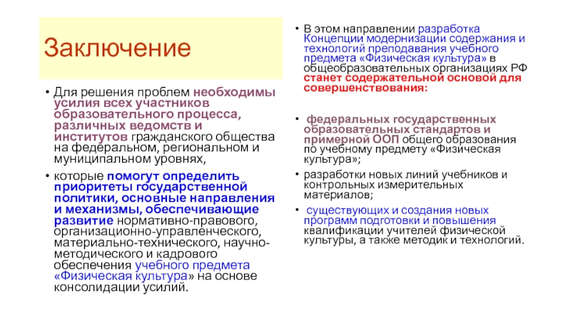 В этом направлении разработка Концепции модернизации содержания и технологий преподавания учебного предмета «Физическая культура» в общеобразовательных организациях РФ станет содержательной основой для совершенствования: