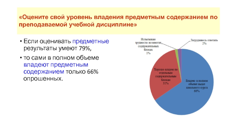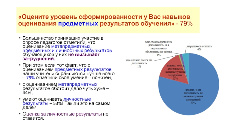 При этом если тот факт, что с оцениванием предметных результатов наши учителя справляются лучше всего – 79% отметили свое умение – понятен,