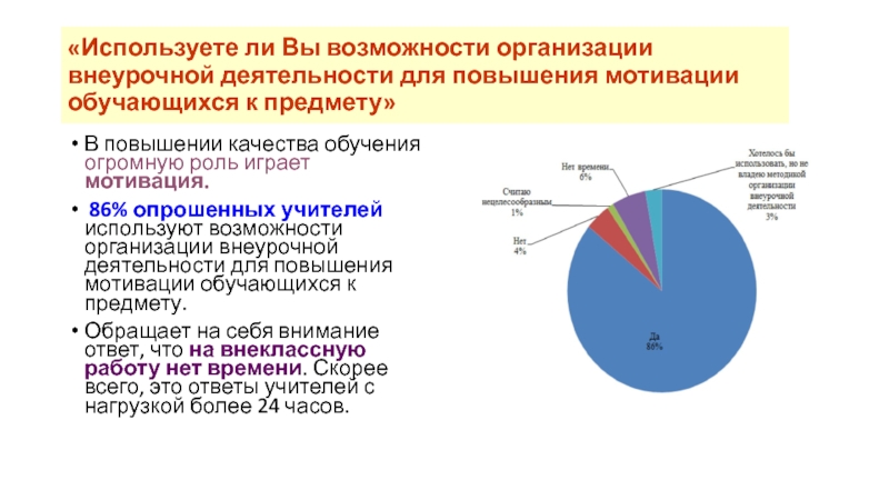 86% опрошенных учителей используют возможности организации внеурочной деятельности для повышения мотивации обучающихся к предмету.