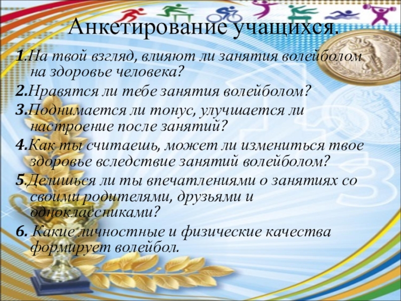 1.На твой взгляд, влияют ли занятия волейболом на здоровье