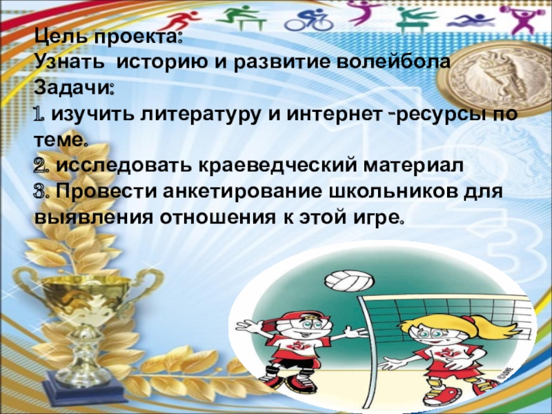 Цель проекта: Узнать историю и развитие волейбола Задачи: 1. изучить литературу и интернет -ресурсы по теме. 2. исследовать краеведческий материал 3. Провести анкетирование школьников для выявления отношения к этой игре.