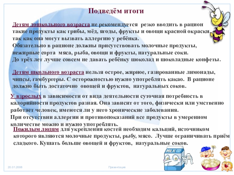 Детям школьного возраста нельзя острое, жирное, газированные лимонады, чипсы, гамбургеры. С осторожностью нужно употреблять какао. В рационе должно быть достаточно овощей и фруктов, натуральных соков.