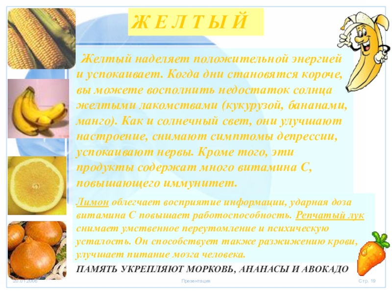 Желтый наделяет положительной энергией и успокаивает. Когда дни становятся короче, вы можете восполнить недостаток солнца желтыми лакомствами (кукурузой, бананами, манго). Как и солнечный свет, они улучшают настроение, снимают симптомы депрессии, успокаивают нервы. Кроме того, эти продукты содержат много витамина С, повышающего иммунитет.
