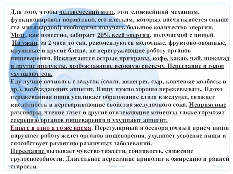 Слайд 20Для того, чтобы человеческий мозг, этот сложнейший механизм, функционировал нормально, его