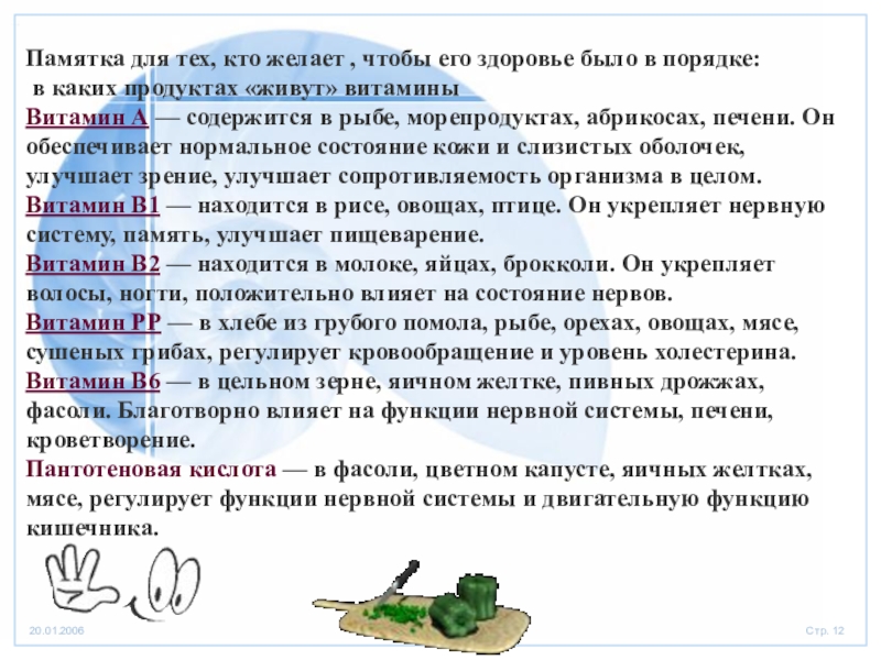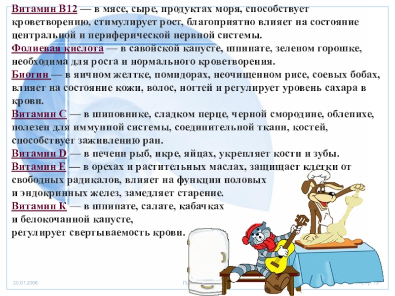 Слайд 13Витамин B12 — в мясе, сыре, продуктах моря, способствует кроветворению, стимулирует